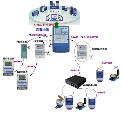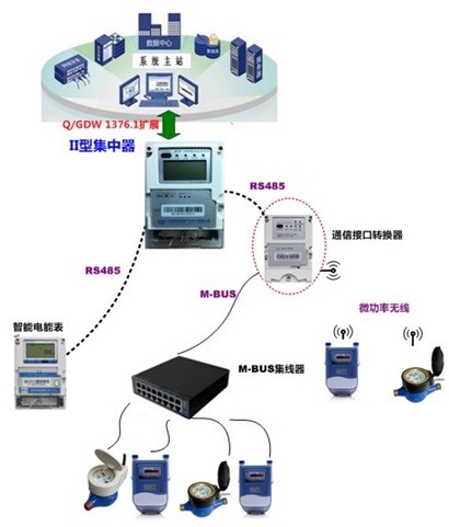 通信接口轉換器接收來自集中器、採(cǎi)集器的抄收命令,向下抄讀水表、氣表、熱量表讀數並(bìng)上傳至集中器、採(cǎi)集器,主要作用是通信信道、通信協議轉換。