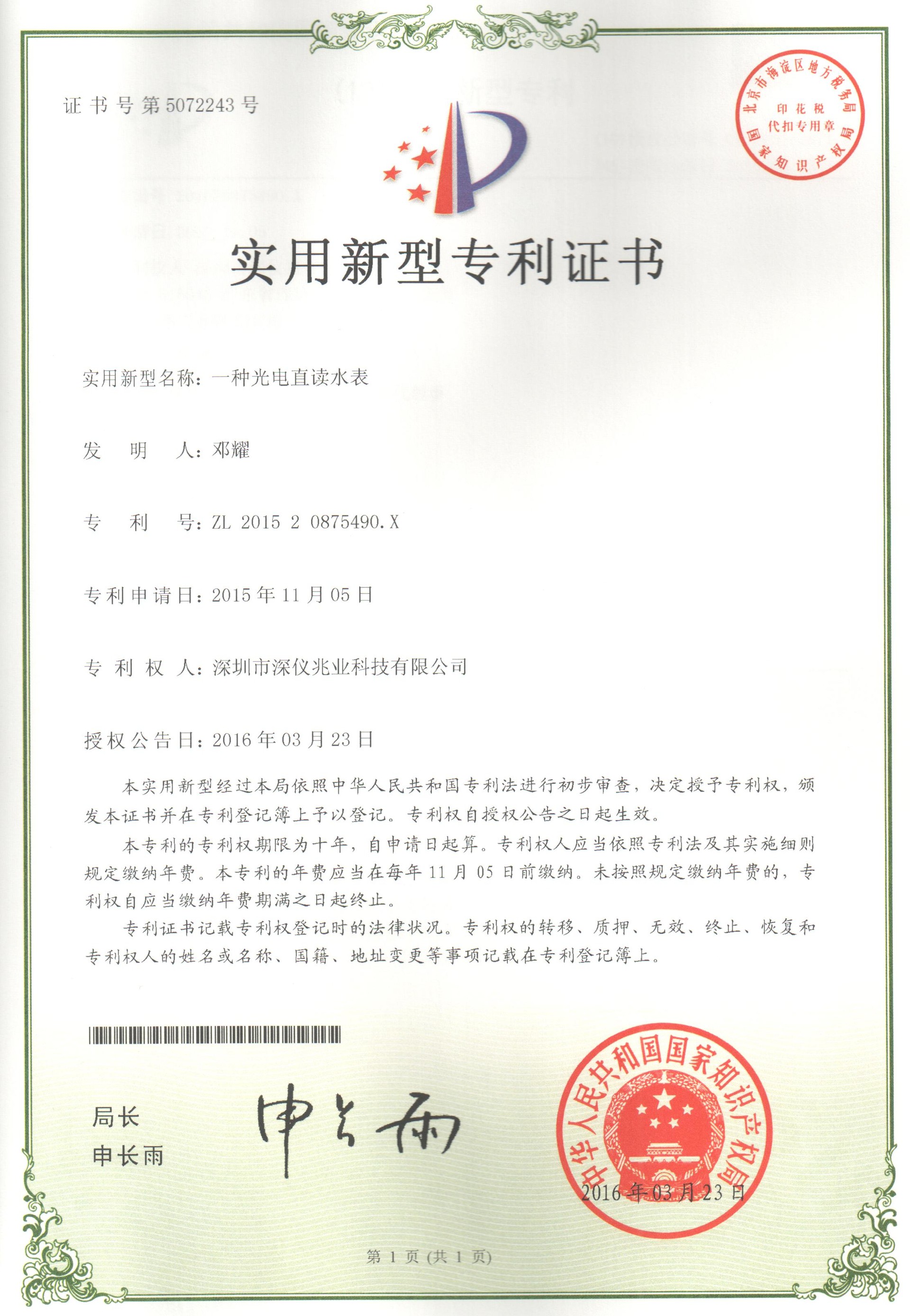水表專利證書
