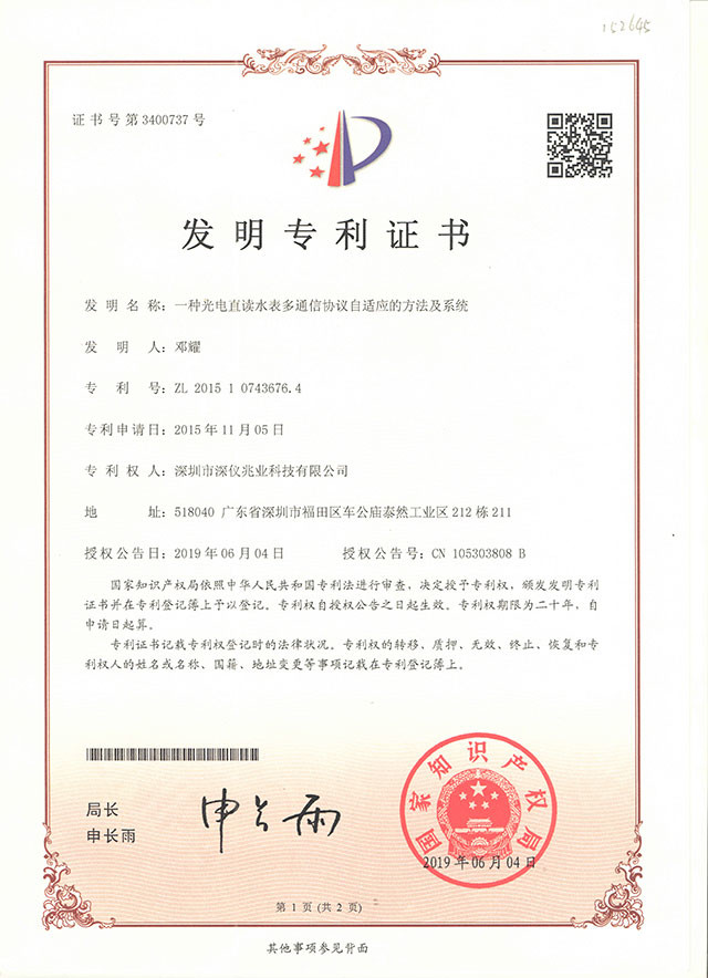 一種光電(diàn)直讀(dú)水表多通信協議自适應的方法及系統發明專利證書