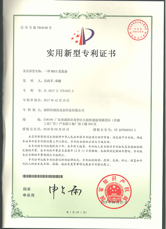 實(shí)用新型專利證書(一種MBUS採(cǎi)集器)